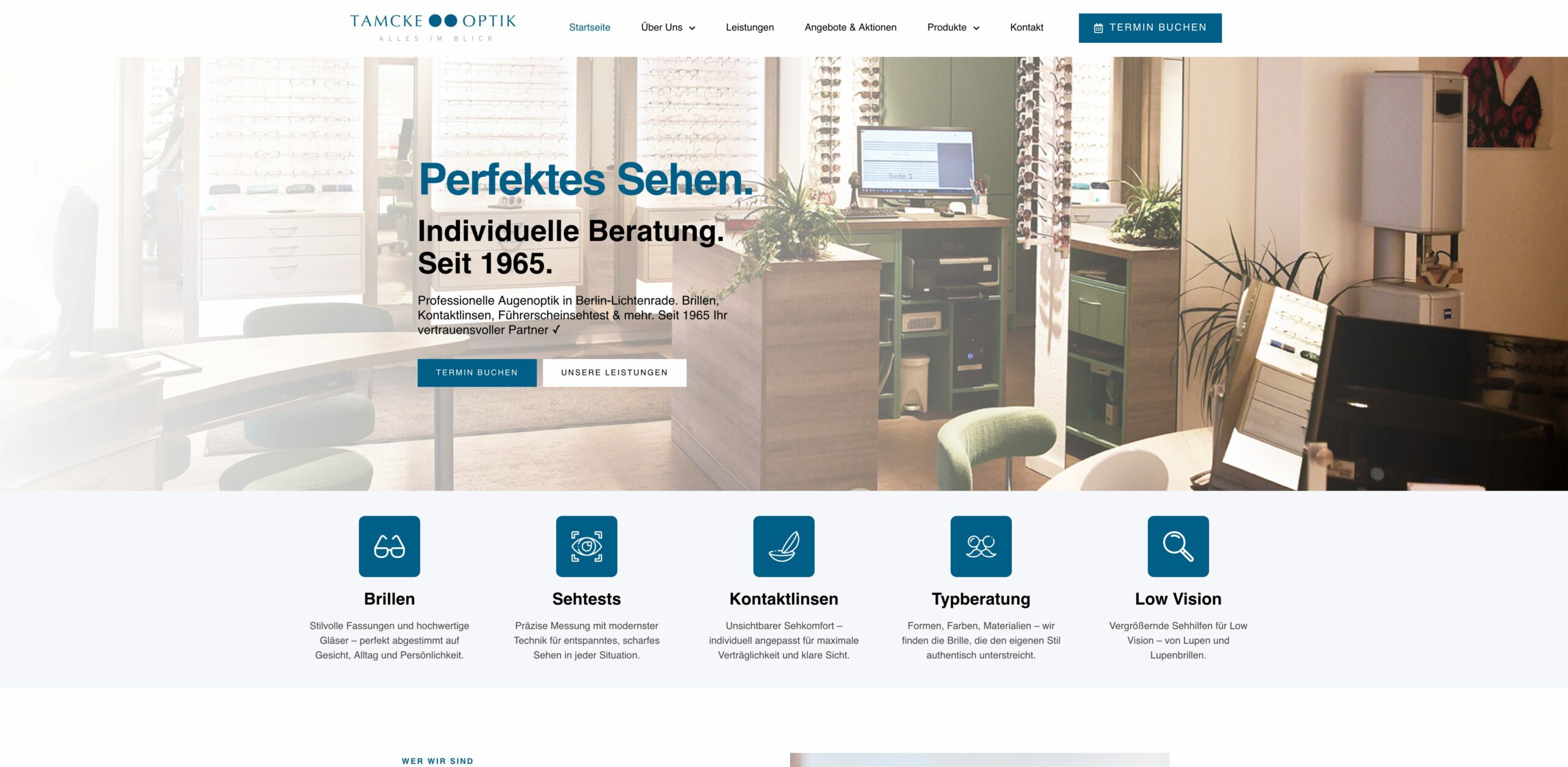 Für Tamcke Optik in Berlin haben wir eine moderne, vertrauensbildende Website entwickelt, die das gesamte Leistungsspektrum eines Optiker-Fachbetriebs klar strukturiert präsentiert. Ziel war es, die Beratungskompetenz, die Auswahl an Brillen und Kontaktlinsen digital erlebbar zu machen und die Terminvereinbarung zu vereinfachen.